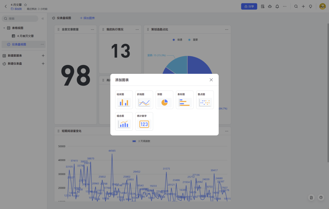 至于刚上线不久的仪表盘,则是为复盘、演示这类重可视化效果的场景准备的。在编辑部,我们直接导入网站后台生成的当月首页文章 CSV 表格数据,然后根据不同的展示需求,利用多维表格的仪表盘功能生成各种图表: