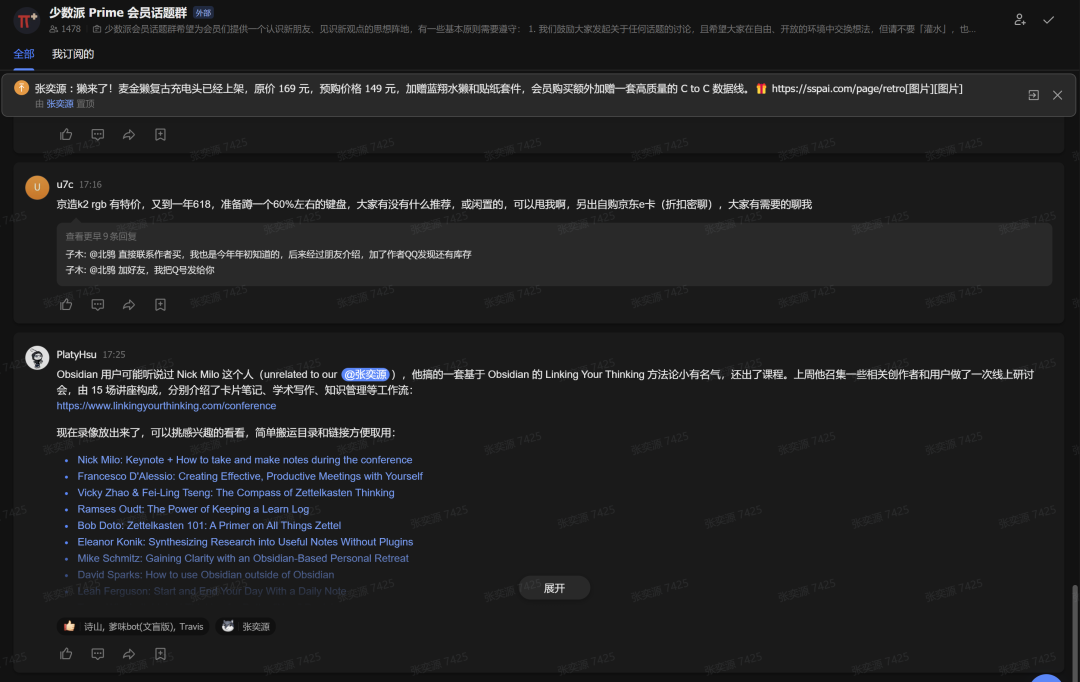 为了更好地连接少数派 Prime 会员,我们建立了会员专属的飞书话题群。话题群的特点是形式类似传统论坛,用户的每条发言都相当于一次「发帖」,其他人的回复和互动也会集中在这条「帖子」下面。在持续的讨论中,这样的形式更利于优质分享的沉淀。