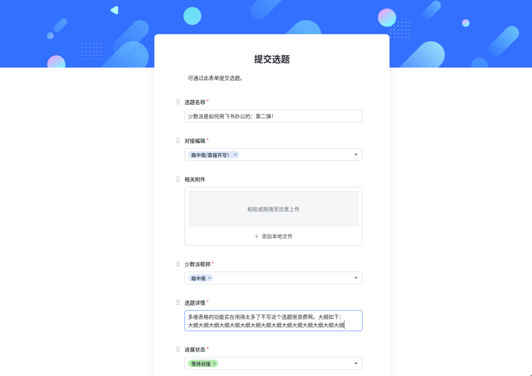 这其实正是大部分「多维表格」类产品协作起来常常会遇到的问题:缺乏面向参与者的必要引导。而在飞书多维表格中,我们通过表单视图功能对数据录入流程进行了规范化,直接在第一步就指定好哪些数据必须填写、哪些数据可以选填
