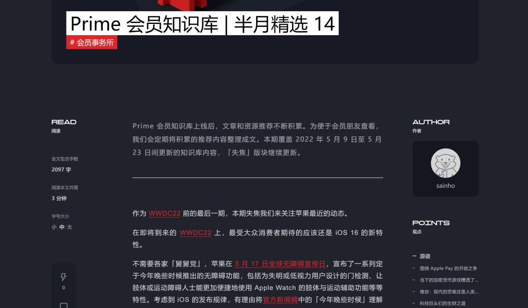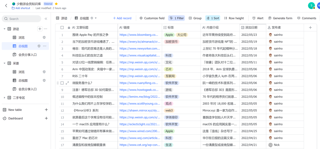 由此,我们也更进一步,利用飞书群组的文档权限管理特点,为 Prime 会员们提供了专享知识库。会员知识库使用飞书多维表格搭建,主要分为「游迹」和「采菱」两个版块。其中,「游迹」版块主要分享编辑们近期看到的好文章,而「采菱」则偏向推荐实用的工具、服务和网站。