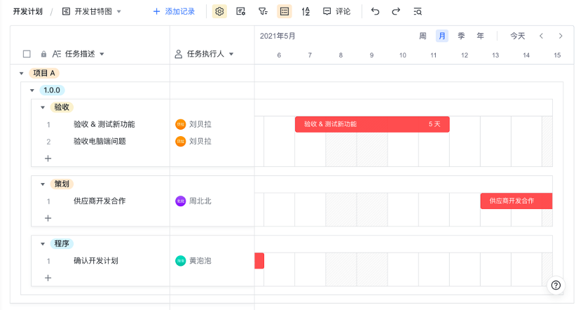 中,有可以安排每个项目、每个岗位、每个人工作内容的研发计划表,也有能够清晰展示每个任务、每个版本、每个岗位、每位成员任务内容和时间安排的甘特图;当项目成员需要了解自己在项目中的全部开发任务时,直接通过人员分组筛选功能就能以人员为维度转换出一份任务清单……