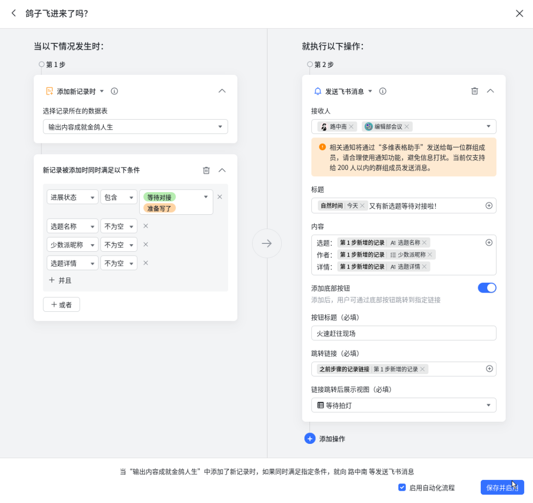 以这张「鸽子飞进来了吗?」流程为例,这套自动化的目的是在作者通过表单提交选题的同时,采集这条数据的某几条信息(作者、选题详情等)并推送给编辑部会议群组的所有成员,同时附上跳转按钮,让对选题感兴趣的编辑可以「火速赶往现场」。