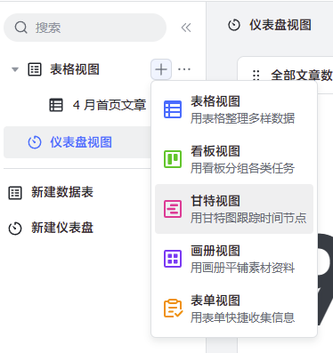 除了对晦涩、繁复的传统表格功能进行重新梳理,多维表格在数据加工这件事情上也做到了「人如其名」,同样一份数据,在多维表格中我们可以最多五种不同的方式进行「解读」:团队内部的任务数据可以转换为更加直观的看板,需要严格按照时间和开发周期推动的项目数据更适合用甘特图来追踪,需要分发、填写和回收的数据不妨做成表单,销售、运营等数据需求则更推荐用仪表盘来进行呈现。