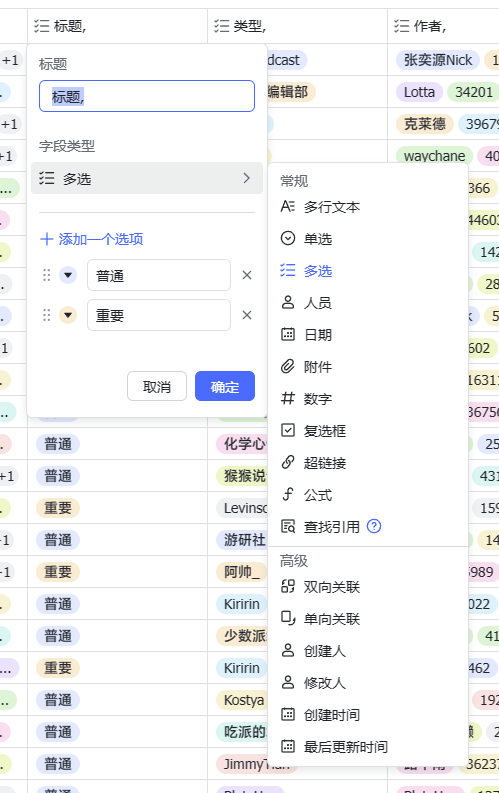 具体而言,只需在选题看板中新增「关联数据」这一字段类型,然后将数据来源选定为表格中的作者名单数据,即可实现作者数据在表格和看板之间的关联选择。