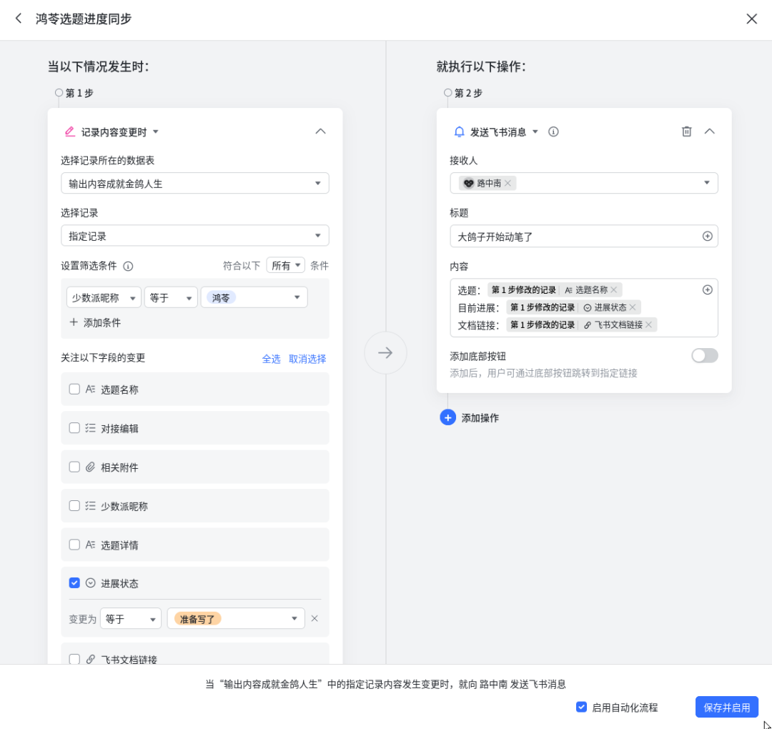 如此一来,每一条新建的多维表格数据都会带有完整的信息,选题推进的阻力大大减少。后续使用「自动化流程」时也可通过这些字段来进一步进行筛选。