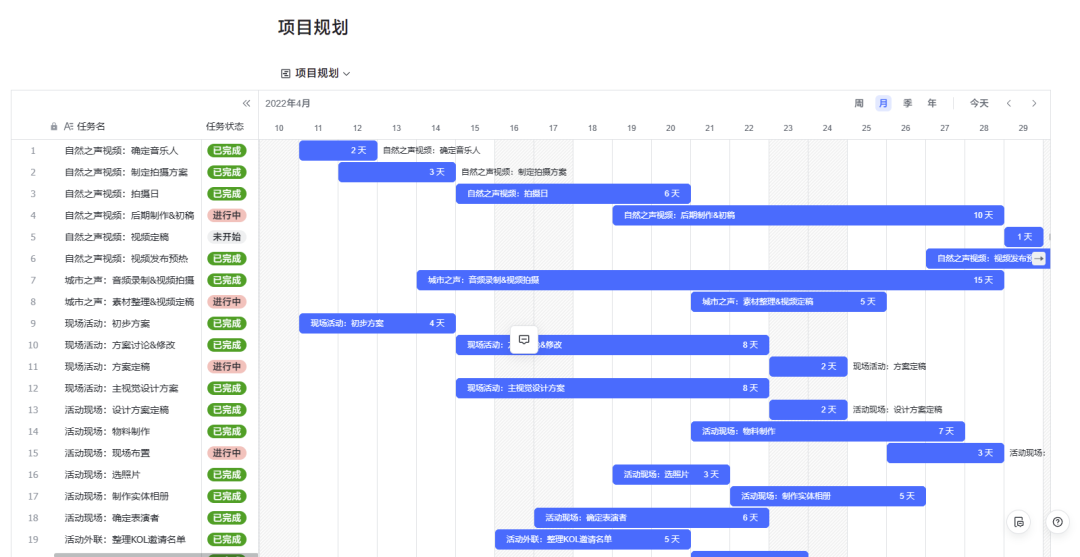 除了选题任务和日常排稿的运作,同事们偶尔也会在一些相对独立的任务中选择用甘特图而不是看板。在甘特图视图下,单个任务的起止时间和持续周期更加直观,非常适合那些需要严格把控时间节点、统筹不同任务推进状况的项目,在活动策划方案中插入甘特图也更易于客户理解,很容易给人留下有条理、组织能力强的好印象。