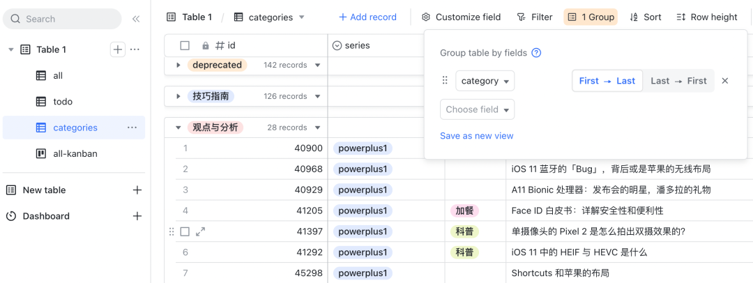 为了减少错误,我们额外创建了几个起「助攻」作用的视图:一个用来分组展示各个类别的文章,以便检查分类标准是否前后一致;另一个用来定向筛选分组信息为空的记录,以便了解目前的分类进度、避免遗漏。这在 Excel 中固然也能通过分类汇总、透视表等功能实现,但在多维表格中则是两三次点击就能完事。