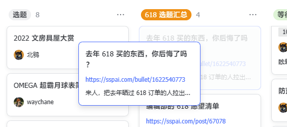 多维表格完全能够满足编辑部对看板工具的主要需求。通过自定义不同的字段类型,我们根据少数派网站首页文章的实际情况,为看板卡片增加各种清晰、明了的状态标签,包括文章是什么类型、现在是什么状态、截稿日期和发布时间各是什么时候、是否需要配合进行客户端推送等等。