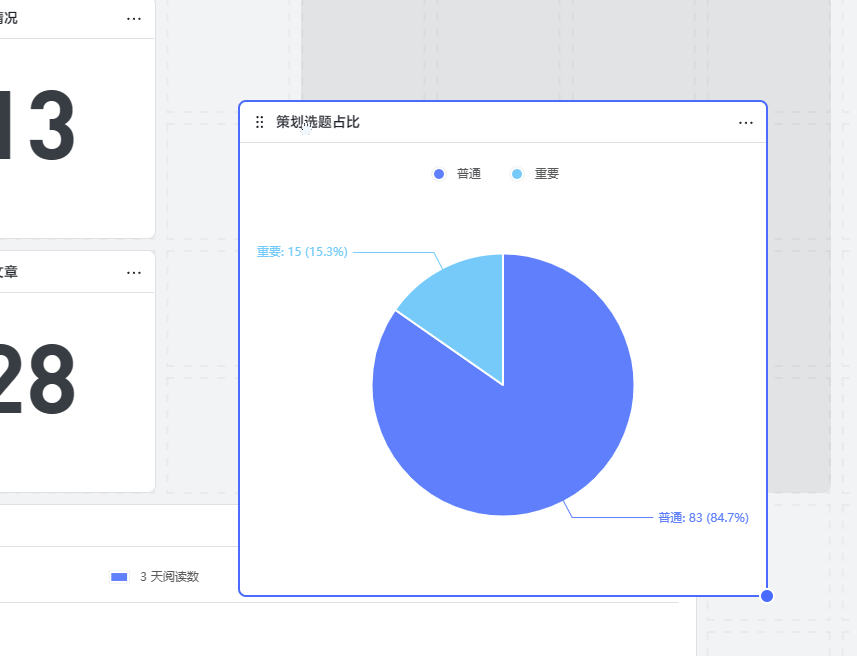 仪表盘生成的图表墙支持拖拽和网格大小自定义,稍加排列,就能生成一个集数字统计和折线、柱状、饼状图表为一体的仪表盘页面。因为仪表盘数据本身是与表格数据所关联的,表格内容有更新、删减时,数据变化也能直接反映在仪表盘上。