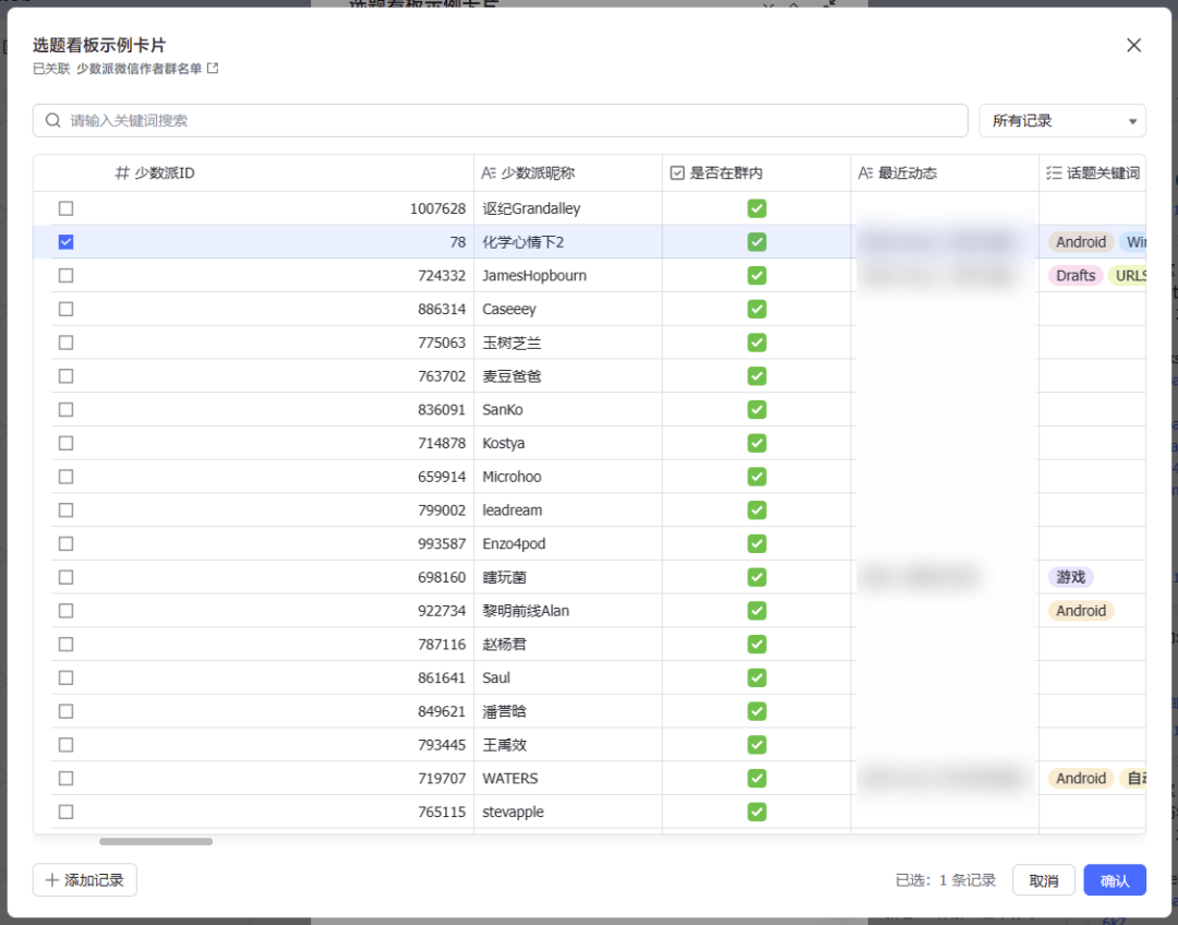 值得一提的是,多维表格此前上线的关联表格数据功能也非常实用,我们也借助这个功能将作者名单和选题看板关联了起来。
