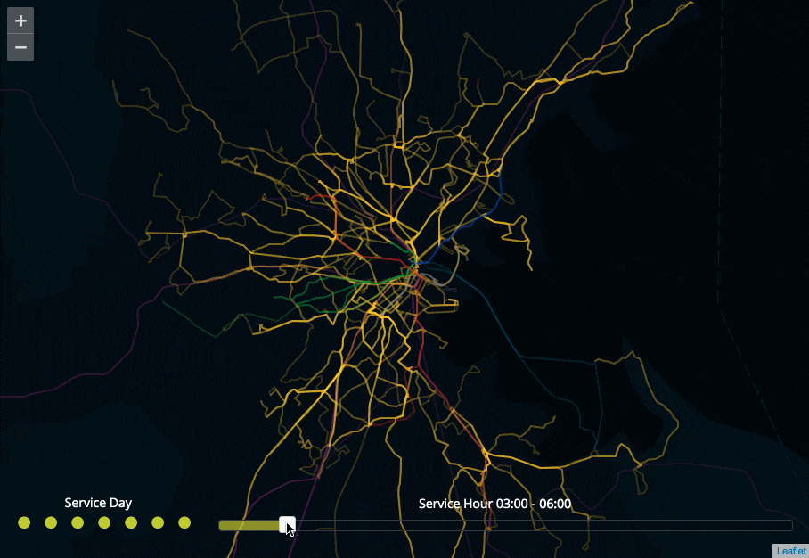 第一个是实习中为MBTA市场部团队做的一个简单的可视化,可以通过滑动滑条等操作来了解MBTA在不同时段的服务网络。技术上没有什么特别的,但有意思的是,一位资深的MBTA经理看到后感叹说,每次她都从我做的这些可视化项目学到了新的业务知识。可见,即便是对于面对业务数据很多年的人,可视化也能提供新的洞见。