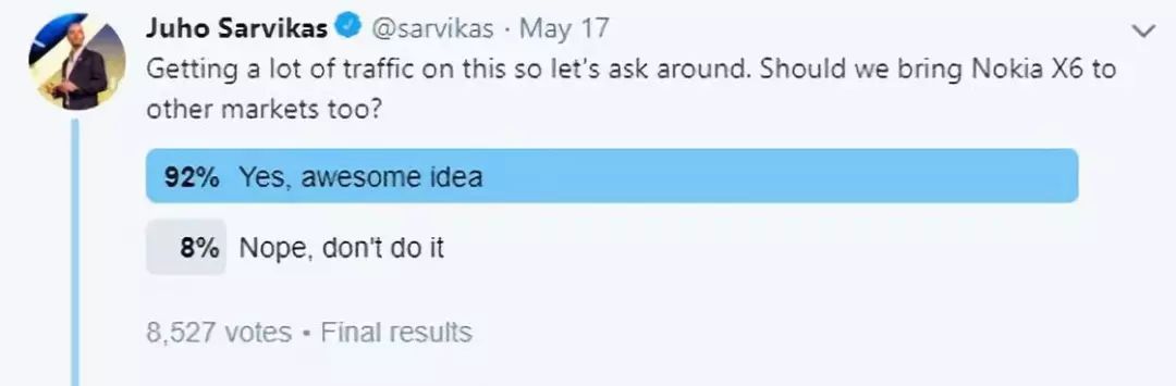 诺基亚社区对NOKIA X6手机反响积极,因此HMD Global首席产品官Juho Sarvikas昨天在推特上发起了一项调查,让用户决定诺基亚X6是否要在国际市场上发售。