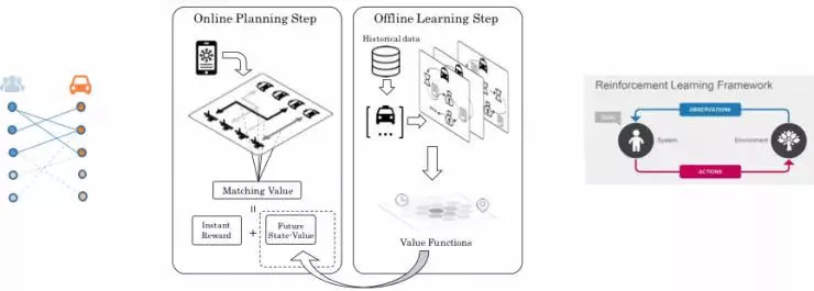 为了解决上述问题,滴滴技术团队创新性地提出了一个融合强化学习和组合优化的框架。算法的主要思路如下: