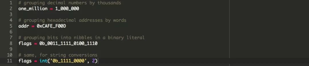 PEP-515 在数字中引入了下划线.在 Python3 中,下划线可用于在整数,浮点数以及复杂数字中以可视化的方式对数字进行分组.