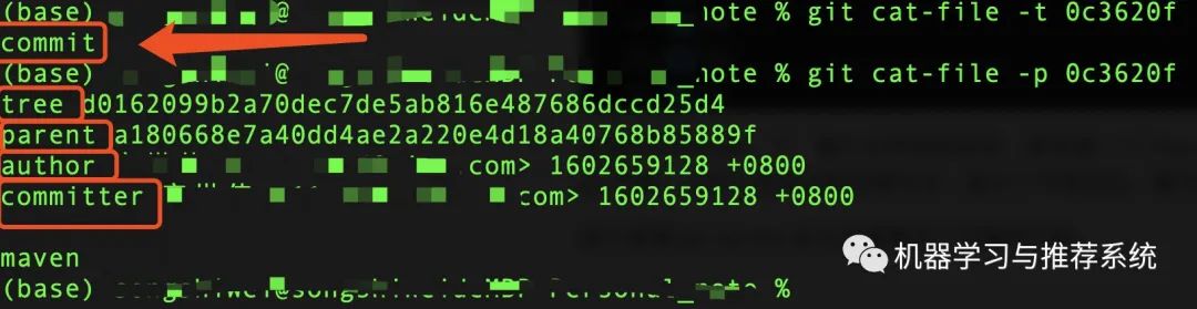 首先我们可以看到这个 0c3620f 的对象是一个 commit 对象,接着我们用 -p 参数来查看其中的内容,发现它指向一个 tree 对象,指向一个 parent 对象(这个 parent 就是当前 commit 对象的前一次 commit),此外还保存了 commit 的作者等信息。