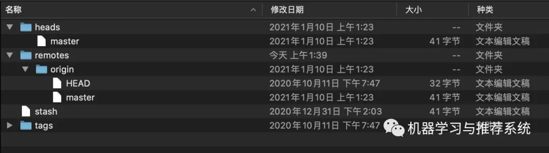 「refs」:还有一个值得关注的点文件夹是 .git/refs,可以看到当前我的 refs 文件中还有三个文件夹,分别保存了 head 对象指向的位置,remotes 的信息,以及 tags 的信息。
