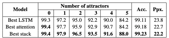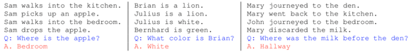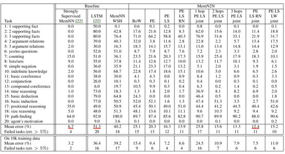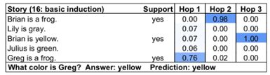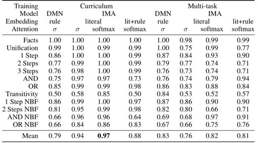 每一列代表一个样本,黑色字体的句子为已知事实,蓝色字体的句子为问题,红色字体标出的是答案。解决这类问题的一般策略为根据答案在已知事实中逆向回溯寻找答案(backward chaining,回退式链式推理)。下表给出各个模型的准确率对比: