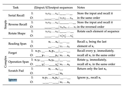 这个实验是关于改进的NTM模型进行的。下面的表格展现的是神经科学中常用的测试记忆能力的实验示意,以接下来要说明的任务“Ignore”为例,表格中这一行中标识代表在不同时刻的输入,