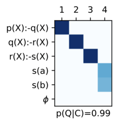 该模型在这个任务上学习到的策略为上文提及的backward chaining,将每一个推理时刻模型关注到不同句子的强度可视化,可以得到下图: