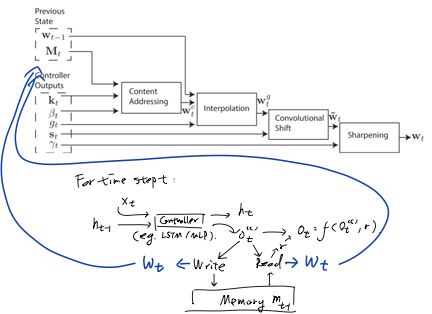 如下图所示,神经图灵机模型(Neural Turing Machine,NTM)模型也可以归为第二类框架,与别的模型的不同也仅在于存储模块是一个可随机访问的数组结构、特别设计的读写方式。