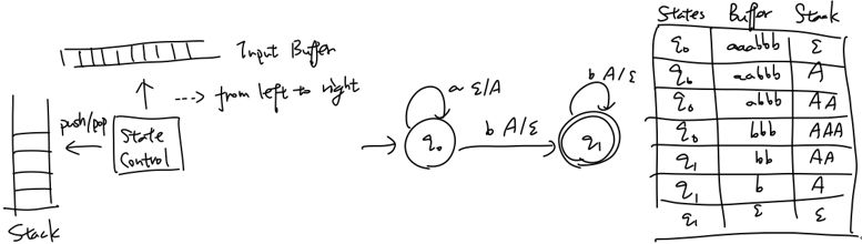从形式语言的角度来说,上下文无关文法(CFG)以及其对应的PDA可以建模程序语言,能够处理递归文法结构,下图简单的以计算表达式的解析(parsing)来举例: