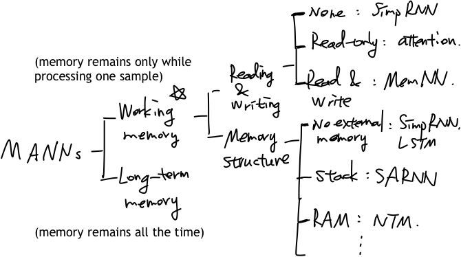 工作记忆相关模型可以按照两个分类方式进行划分,一个是简单的读写match机制的有无,可以分为无读写、只读(如注意力机制,attentmatchion)和既读又写;另一个分类方式是按照存储的结构或者说是按照类比于自动机理论体系的分类方式,分无外部存储、栈式外部存储以及无限制的随机存储。