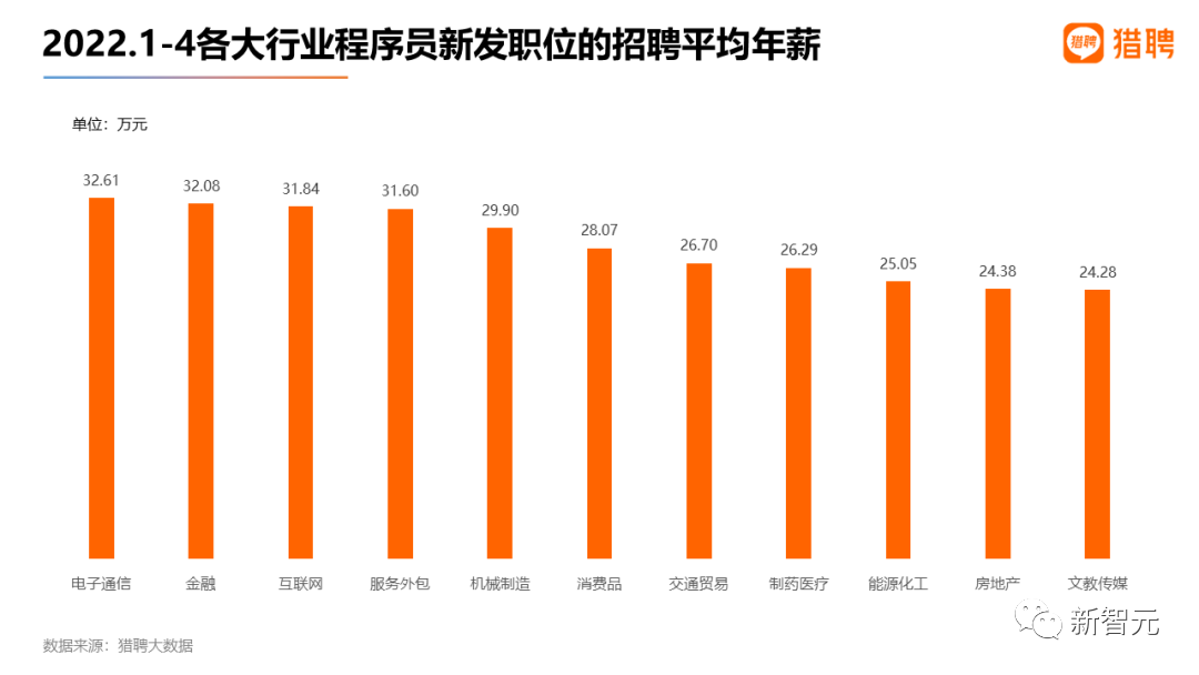 在这些行业中,电子通信、金融、互联网、服务外包行业的程序员职位招聘平均年薪均超30万,排名前4。