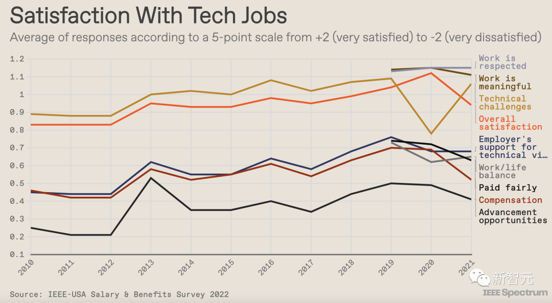 IEEE-USA 调查的工程师的总体工作满意度在 2021 年下降,主要与薪酬和晋升机会有关。然而,对工程工作的技术挑战的满意度显著提高。