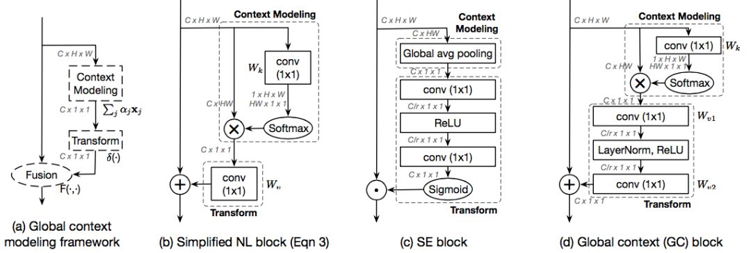 通过对每个步骤的比较研究,作者发现简化版的 NL Block 和 SE Block 都有各自的缺陷,通过结合每个步骤的最佳实现,即吸收了简化版的 NL Block 全局上下文建模能力强与 SENet 计算量低的优点,作者实现了一种新实例,称为全局上下文模块(Global Context Block)。下图展示了全局上下文建模框架 (a)、简化版 NL Block (b)、SE Block (c),以及在本文提出的 GC Block (d):