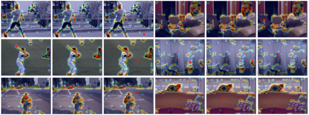 为了深入理解 NLNet,在目标检测任务中,作者为每张图选取多个查询点,对其注意力图进行可视化,如下图所示: