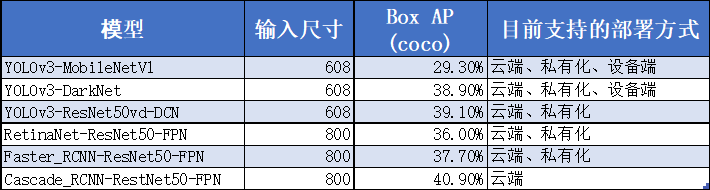 各检测模型的效果,以及支持的部署方式如下表所示: