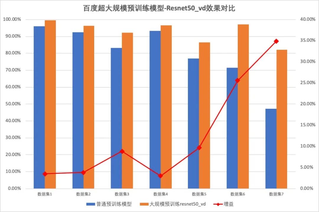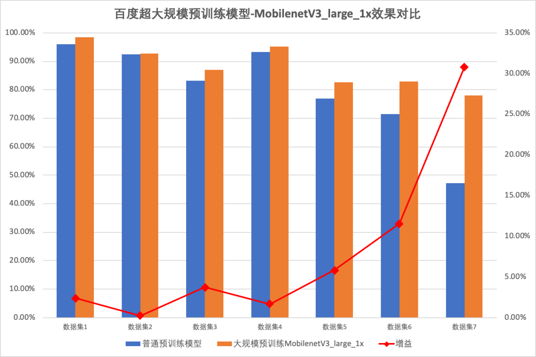 在图像分类模型中,使用百度超大规模预训练模型的Resnet50_vd相比普通模型在各类数据集上模型效果平均提升12.76%,使用百度超大规模预训练模型的Resnet101_vd,相比于普通预训练模型,平均提升13.03%,使用百度超大规模预训练模型的MobilenetV3_large_1x,相比于普通预训练模型,平均提升8.04%。