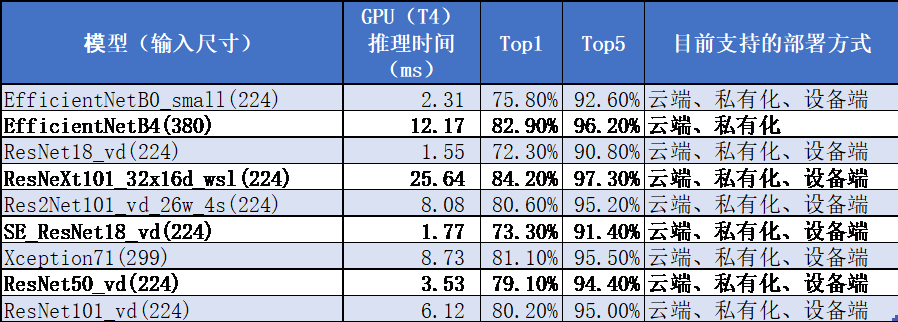 新增的分类模型的推理时间、效果,以及支持的部署方式如下表所示:
