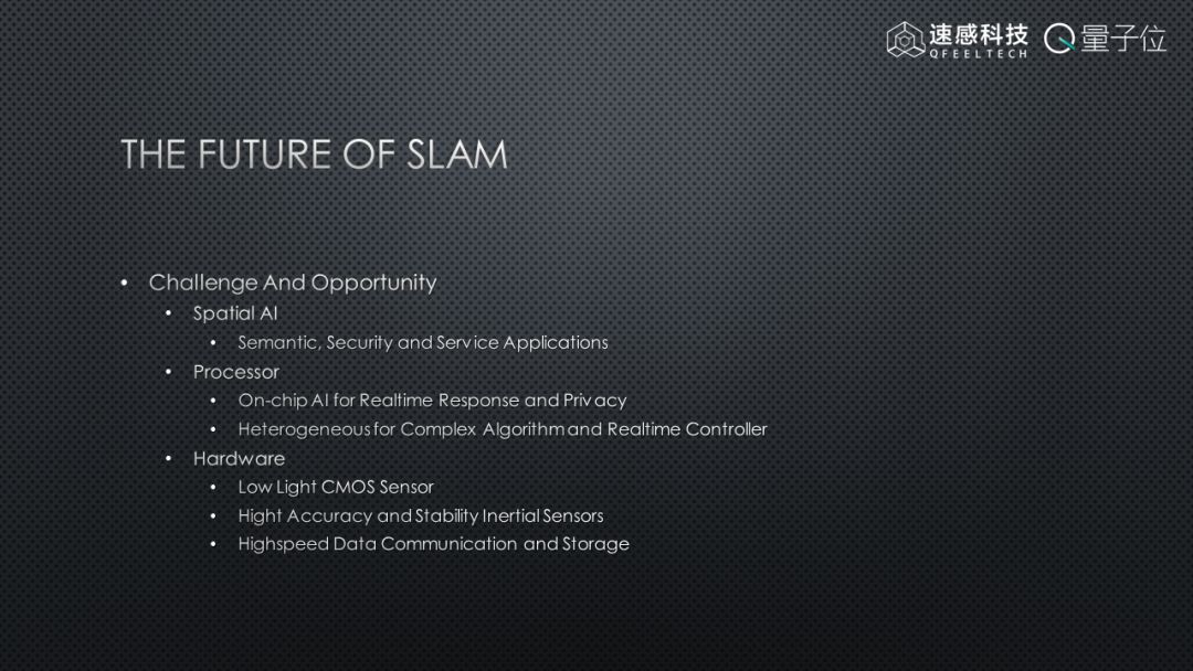 在硬件上也需要有更高精度的IMU,提高整个惯性测量的性能。还需要更快的数据传输和数据存储,SLAM随着地图的增大,它的数据量是迅速增加的,如果不能够将这些数据通信和存储的效率提高的话,瓶颈还是比较大,需要各种各样的行业协力才能把SLAM做得更好。