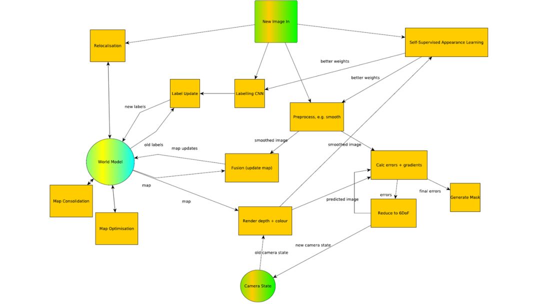 比如说这幅图里面,首先它会分支出几条不同的线,一条线是在定位丢失的情况下做一个重定位,另外一条线是用来更新神经网络模型,然后进行标注,最终形成一个场景语义地图。同时也会用传统的方式,将图像送到SLAM中进行位置姿态的估计,其中会有很多的耦合和数据的内循环,整个架构会相对复杂一些,这也是SLAM目前发展的一个挑战。