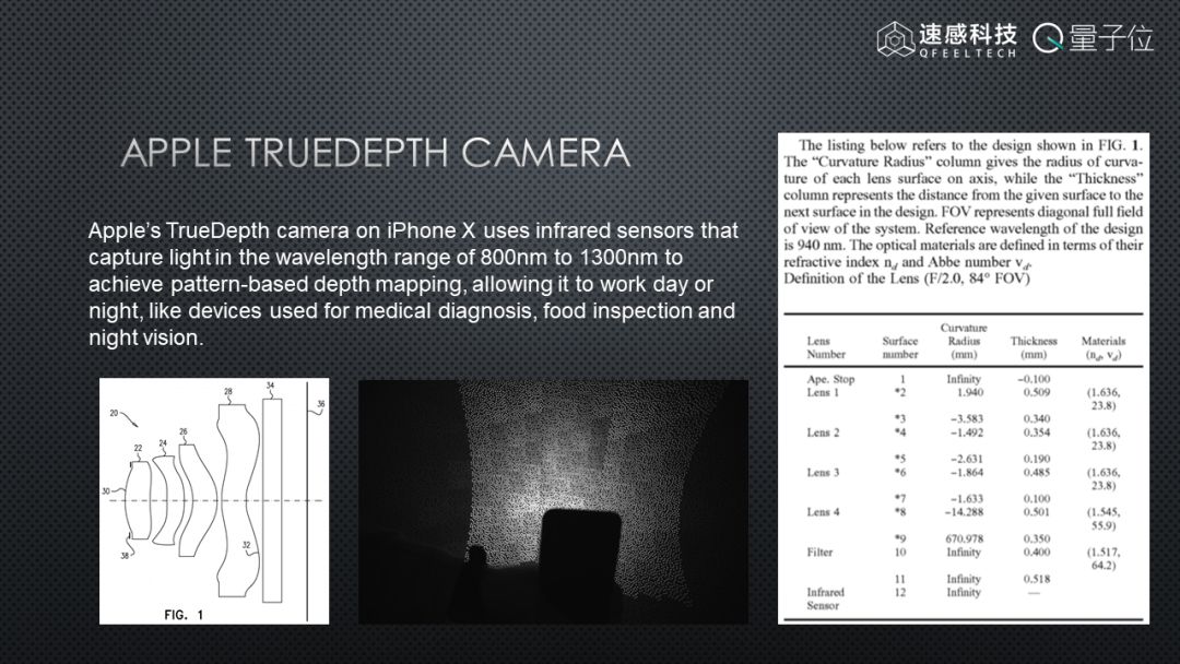 这里是Apple的TrueDepth专利里的一些内容,比如它采用84°FOV的摄像头来捕捉中间这幅图里的点Pattern,这是Apple 2013年收购Prime sense买的专利,并基于这个专利做了一个改进,实现了一个效果很不错的深度图采集。