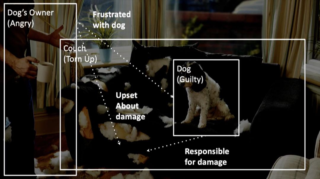 但作为人类,我们看到了什么?我们不仅能知道沙发坏了,还知道是狗干的。我们还可以从一个简单的姿势看出,主人不是很开心。更神奇地,我们可能是从狗脸上的内疚表情中看出来的,而且马上就能看出来。这些就是人脑所做的。我们毫不费力地就能识别环境并唤起记忆。用类比的方法,用熟悉的术语来理解新观点。我们创造的联想可以触发一切,从假设到一首诗。我们能感觉到事件之间的因果关系,把一系列的瞬间变成一个故事,在其他人在场的时候,一个强大的情感维度也出现了。