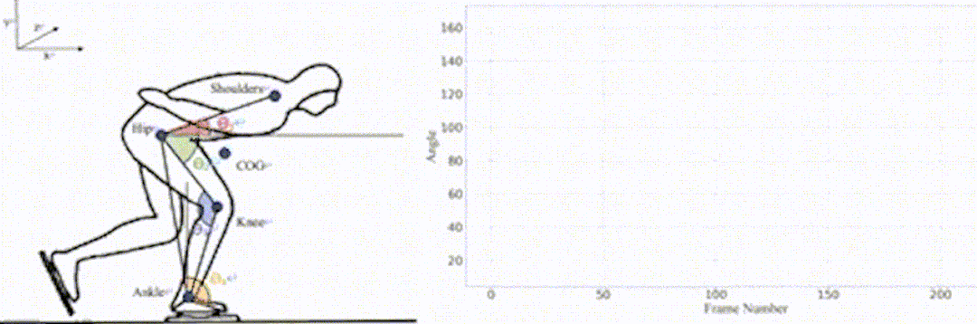 有了数据,可以得到核心关节、膝关节、髋关节的旋转角度和角速度,以及运动员的质心的轨迹和加速度,帮助运动员分析姿态对蹬冰质量和效率的影响。