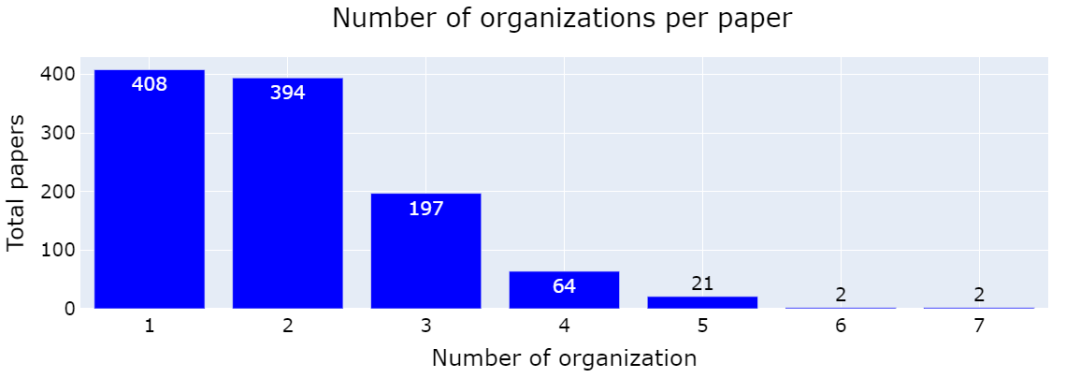 大多数论文有 1 或 2 个组织,但有些论文的撰写有 7 个组织的参与。