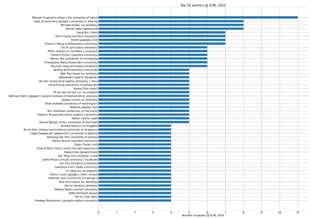 在他之后是 Michal Valko(DeepMind)、Michael Jordan(UC Berkeley)以及 Dale Schuurmans(Google / U. of Alberta),三人均有 8 篇文章被接收。他们也是大多数论文的最后作者(这对大多数作者来说都是如此,许多人都是资深的资深研究者)。虽然没有被列在这张图的顶部,但是普林斯顿大学的 Chi Jin 作为第一作者的论文最多(3 篇第一作者论文超过 6 篇被接受的论文),而 Alexey Drutsa 是来自 YANDEX 的最多的单篇论文(2 篇论文是单独作者超过 3 篇被接受的论文)。