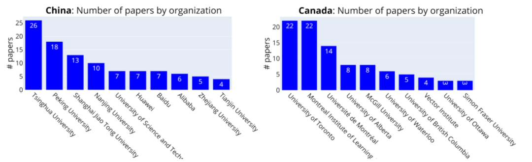 中国拥有强大的机构,但华为、阿里巴巴和百度等公司正在迎头赶上。在加拿大,几乎所有的论文都是大学发表的。另外除了美国和中国大陆,大多数国家和地区发表论文的顶级机构都是大学。从全球范围看,大学发表的论文数量是公司的 3 倍。在美国以外,只有来自英国(DeepMind)、法国(Criteo)、中国大陆(华为、百度、阿里巴巴)、俄罗斯(Yandex)以及韩国(Samsung)的某些机构发表了 5 篇以上的论文。