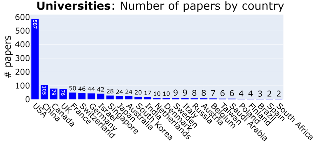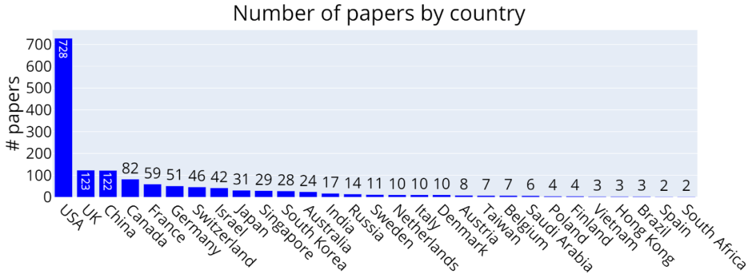 需要注意的是,国家或地区是根据组织机构的总部所在地而定,而非论文作者所在位置。因此,如果一位论文作者在 Google 苏黎世工作,那么该论文被计入美国,而不是瑞士。