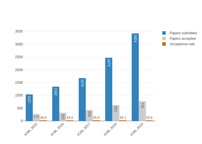 据官方统计,ICML 2020 共提交 4990 篇论文,投稿数量再创新高,而最终接收论文 1088 篇,接收率 21.8%。与往年相比,接收率逐年走低。