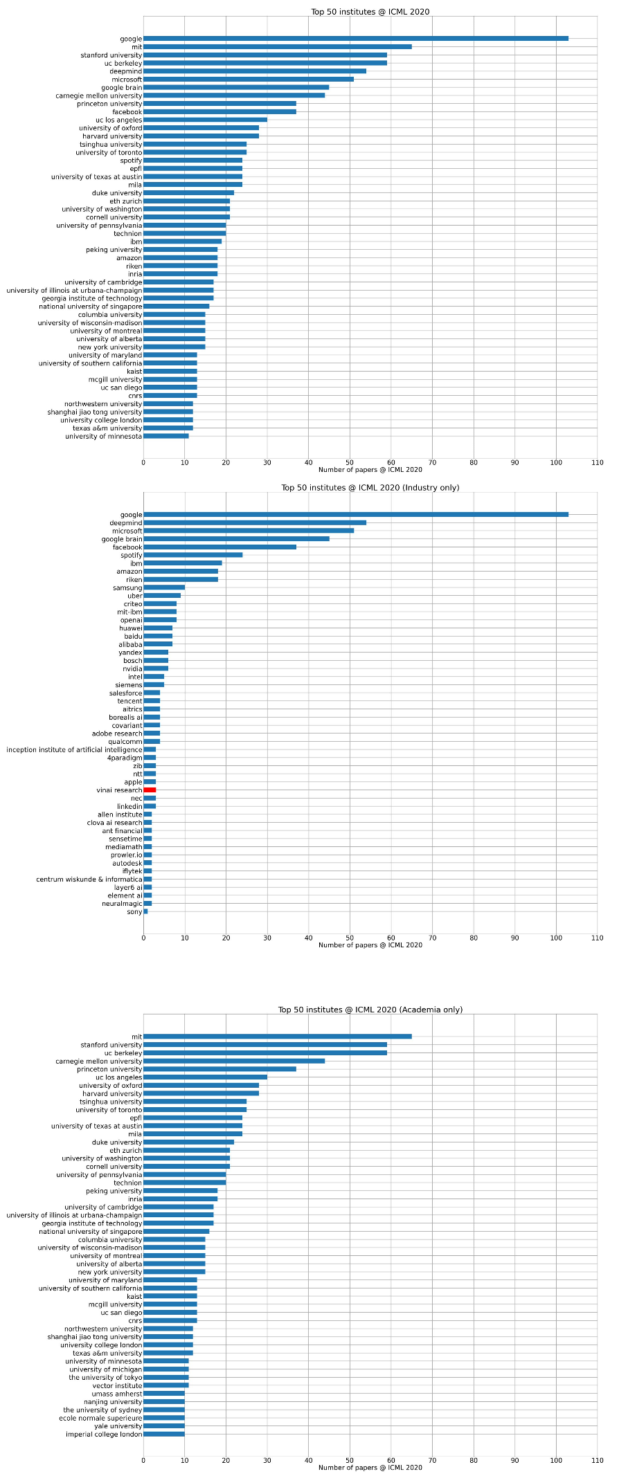 前 50 的机构发表了几乎全部的论文,谷歌公司排名总体第一也是工业界排名的第一,谷歌的附属机构 Deepmind 与 Google brain 也位于工业界排名的前 4 名,微软公司在工业界排名第三。排名最高的大学分别为 MIT,Stanford,UC Berkeley,总体排名也仅次于 Google。在学术机构排名中 CMU 紧追上述 3 所大学排名第四。