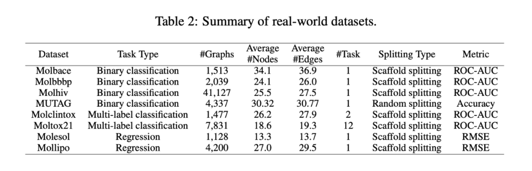 我们在 OGB 的七个分子图性质预测的数据上展开实验,与常用的数据不同的是,这些数据都采用 scaffold splitting 从而使得具有不同结构的图数据划分到训练集和测试集。此外,我们还采用了常用的 MUTAG 数据集用于解释我们的结果。