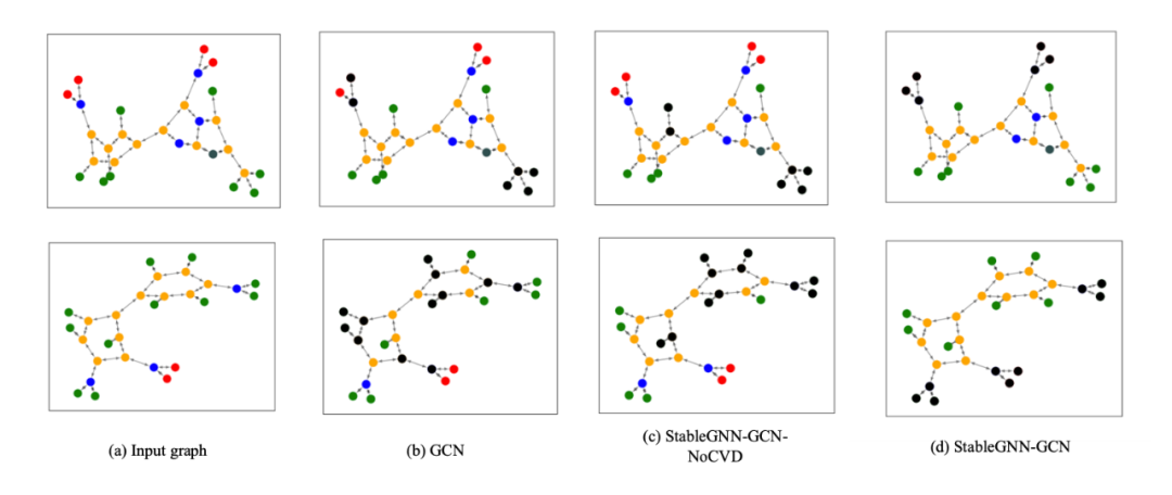 图 4 是 MUTAG 数据集上的可解释性实验。蓝色,绿色,红色和黄色分别代表 N,H,O,C 原子。由 GNNExplainer 产生的最重要的子图被标为黑色。StableGNN 正确的确定了功能团 NO2 和 NH2,这些功能团被认为是对 Mutagenic 有决定性作用的,而其他方法不能找到有解释性的子图做预测。