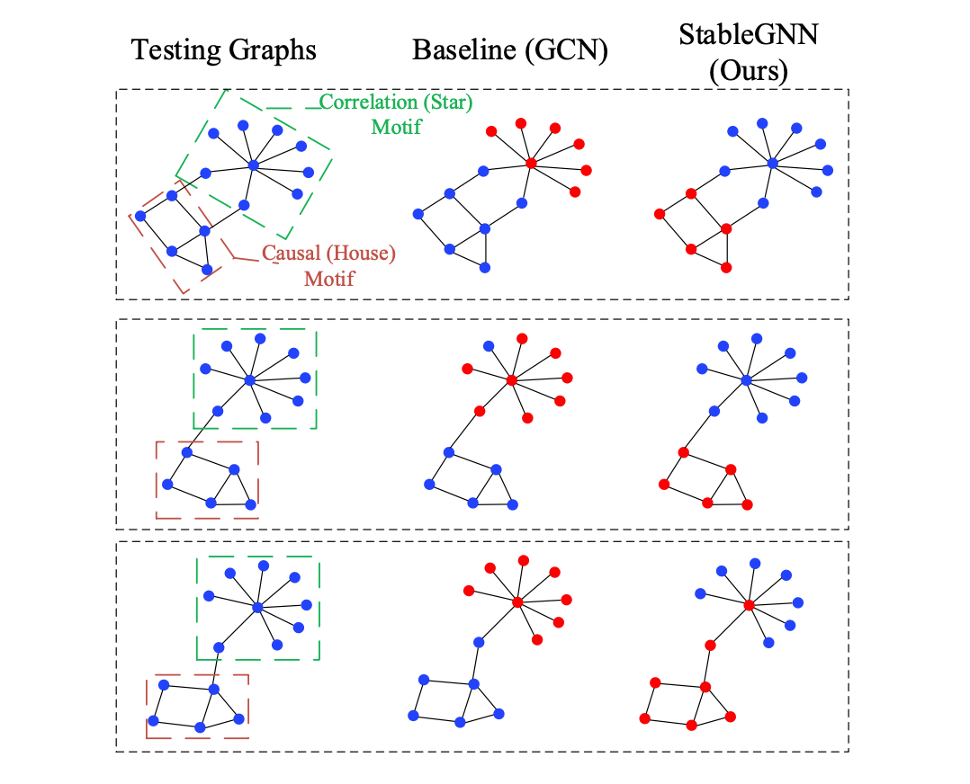 如图 1 所示,以“房子”模体分类任务为例,其中图的标签表示一个图中是否有“房子”模体。GCN 模型是在“房子”模体和“星星”模体高度相关的训练图上训练的。在这个数据上,“房子”模体和“星星”模体将会高度相关。这个意料之外的相关性将会导致“星星”模体的结构特征和“房子”标签的虚假相关。 图 1 的第二列展示了用于 GCN 预测的最重要的子图可视化结果 (由 GNNExplainer 产生)。由结果可知,GNN 倾向于利用星星模体做预测。然而当遭遇没有“星星”模体的图,或者其他模体( 比如,“ 钻石“ 模体) 和星星模体在一起时, GCN 模型被证明容易产生错误的结果。