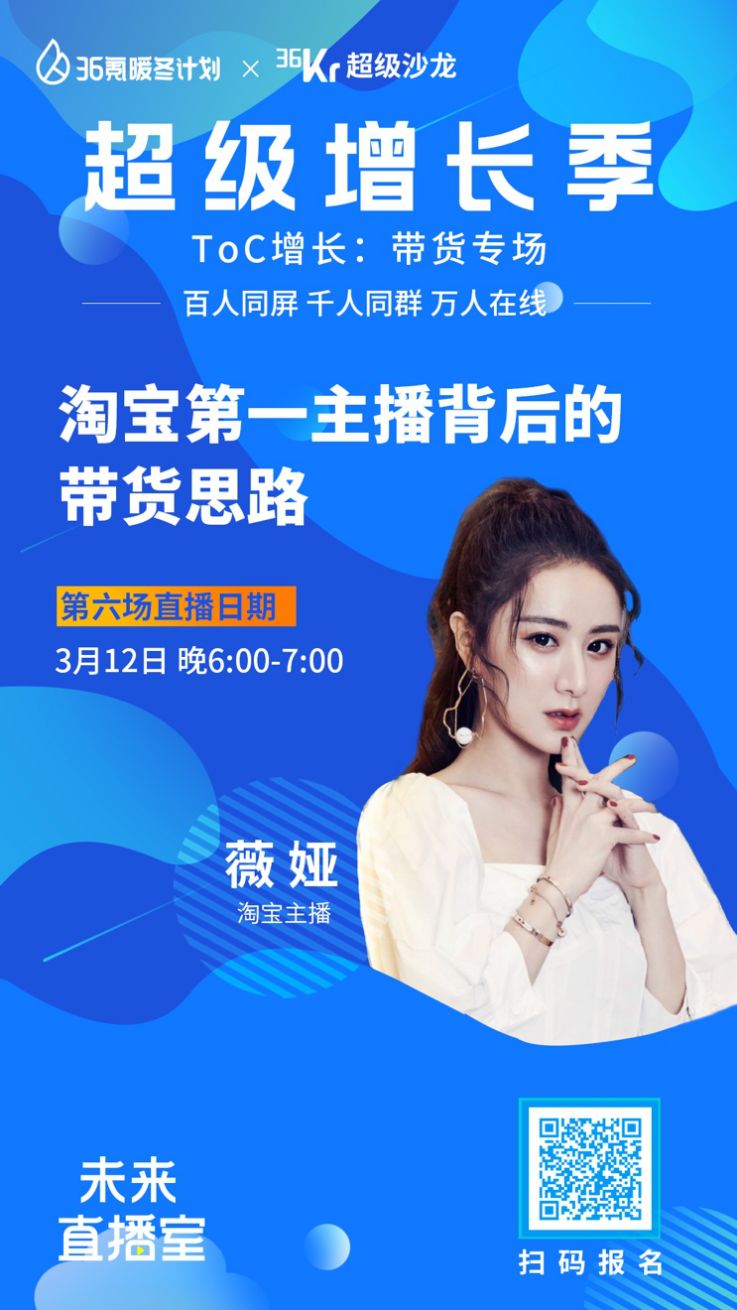 3月12日18:00-19:00,作为36氪暖冬计划“超级增长季”C端增长获客的第三场,也是本次“超级增长季”的最后一场分享活动,我们邀请了淘宝主播薇娅带来《淘宝第一主播背后的带货思路》的分享。为大家揭秘直播天团幕后的协作机制、解析直播带货的技巧、讨论直播行业的发展趋势。