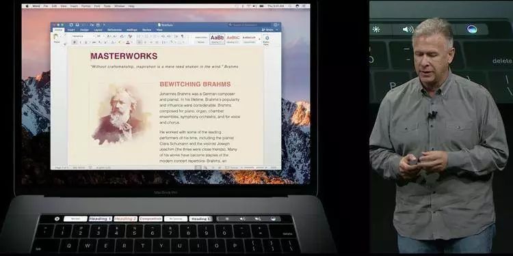 不妨再来到 2016 年十月的苹果发布会上,当蒂姆·库克带来新的 MacBook Pro 时,在产品详细设计介绍环节,时任苹果全球营销高级副总裁的 Phil Schiller 对于用 Touch Bar 代替传统的笔记本电脑功能区这样说: