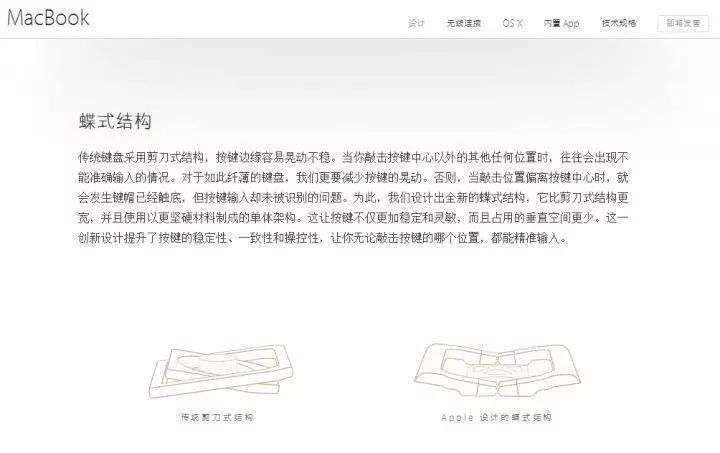 蝶式键盘是伴随 2015 年发布的 12 英寸 New MacBook 而带来的新型设计,为了追求笔记本电脑轻薄的极致,苹果选择利用蝶式来代替传统的剪刀式键盘设计,这种结构也延续到了之后的 MacBook Pro 系列产品上。